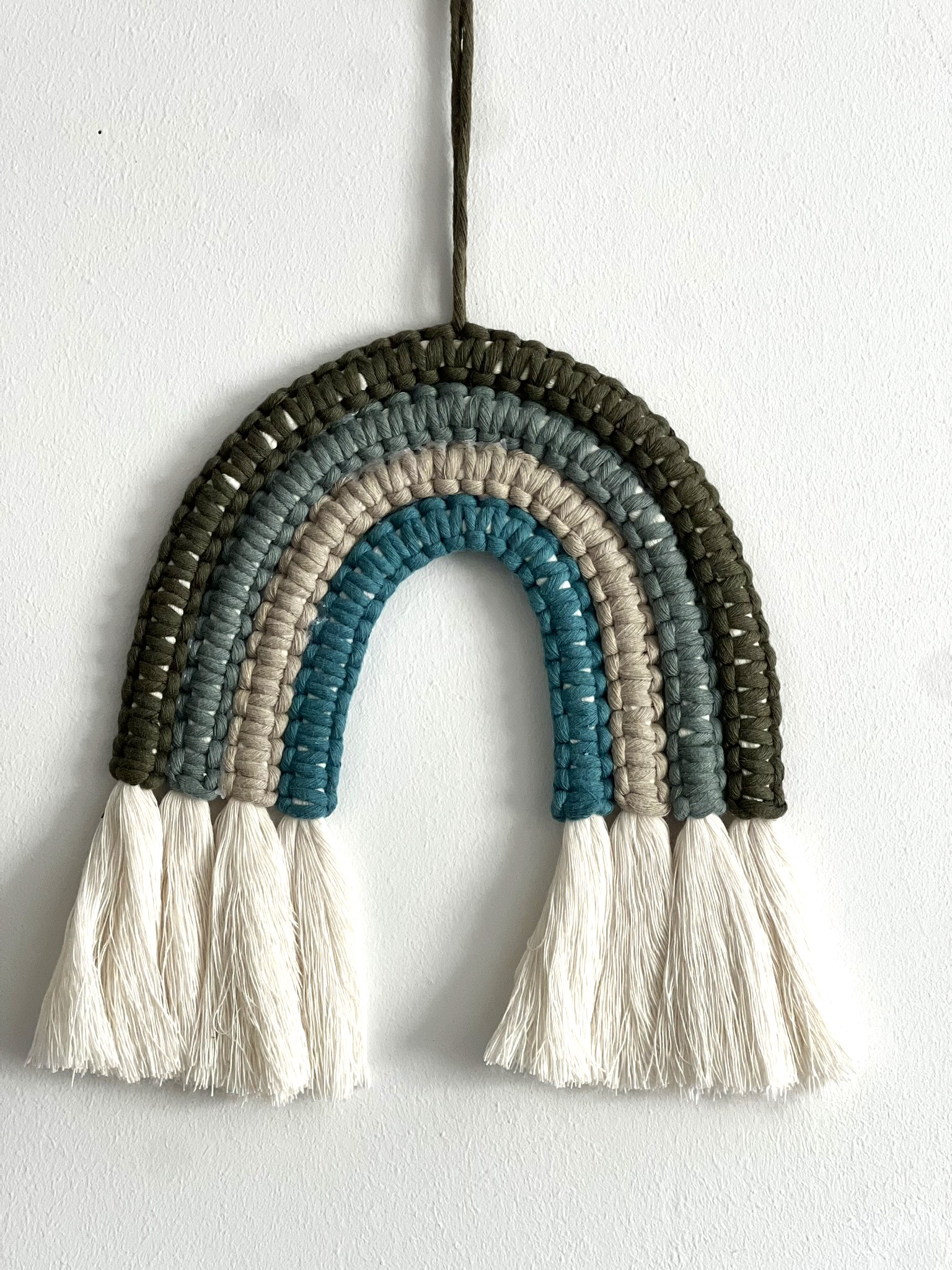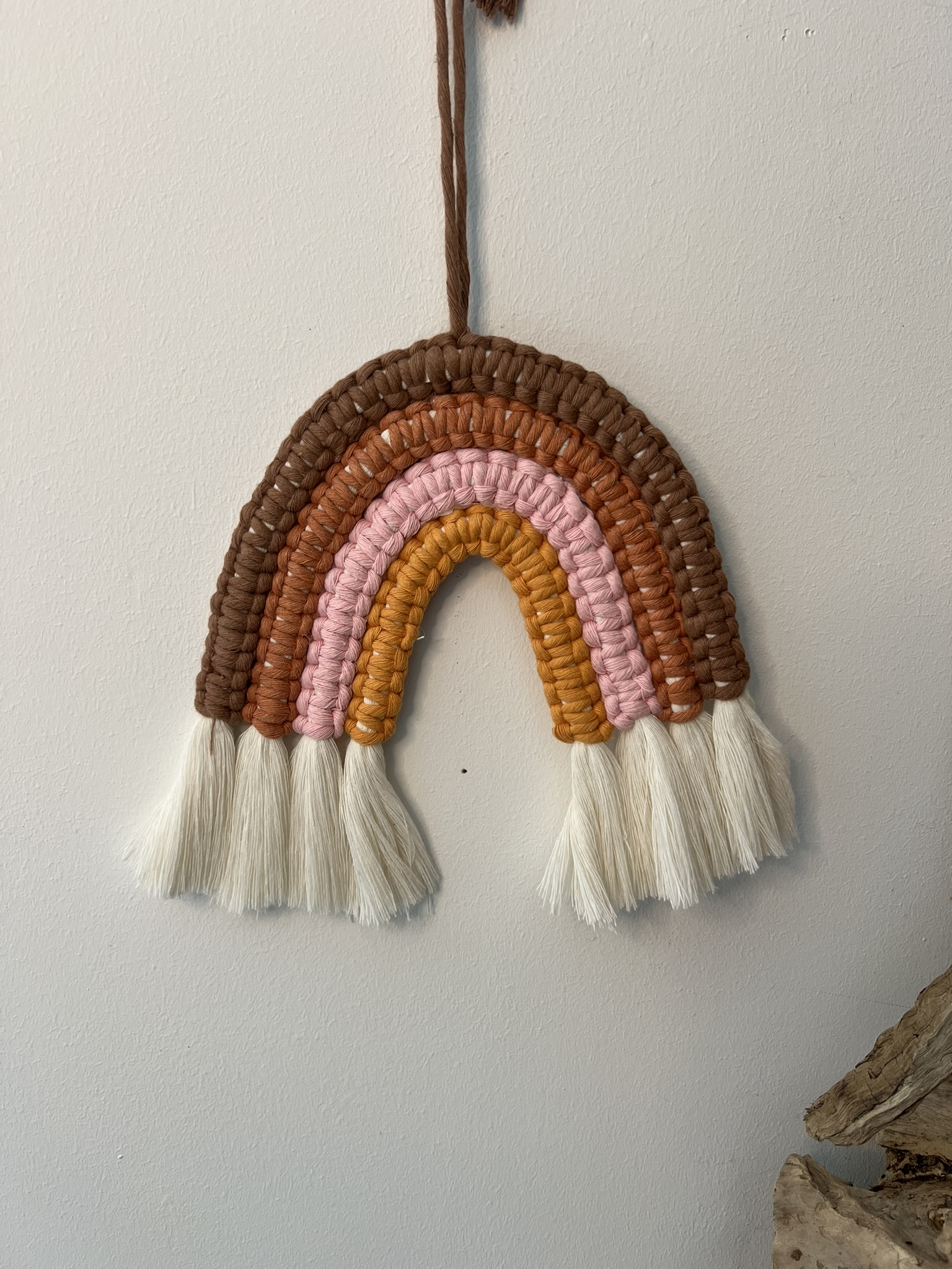 Le fil de macramé nécessaire pour réaliser l’arc en ciel (marron, Terracotta, rose, orange ou kaki, bleu gris, beige, bleu)
