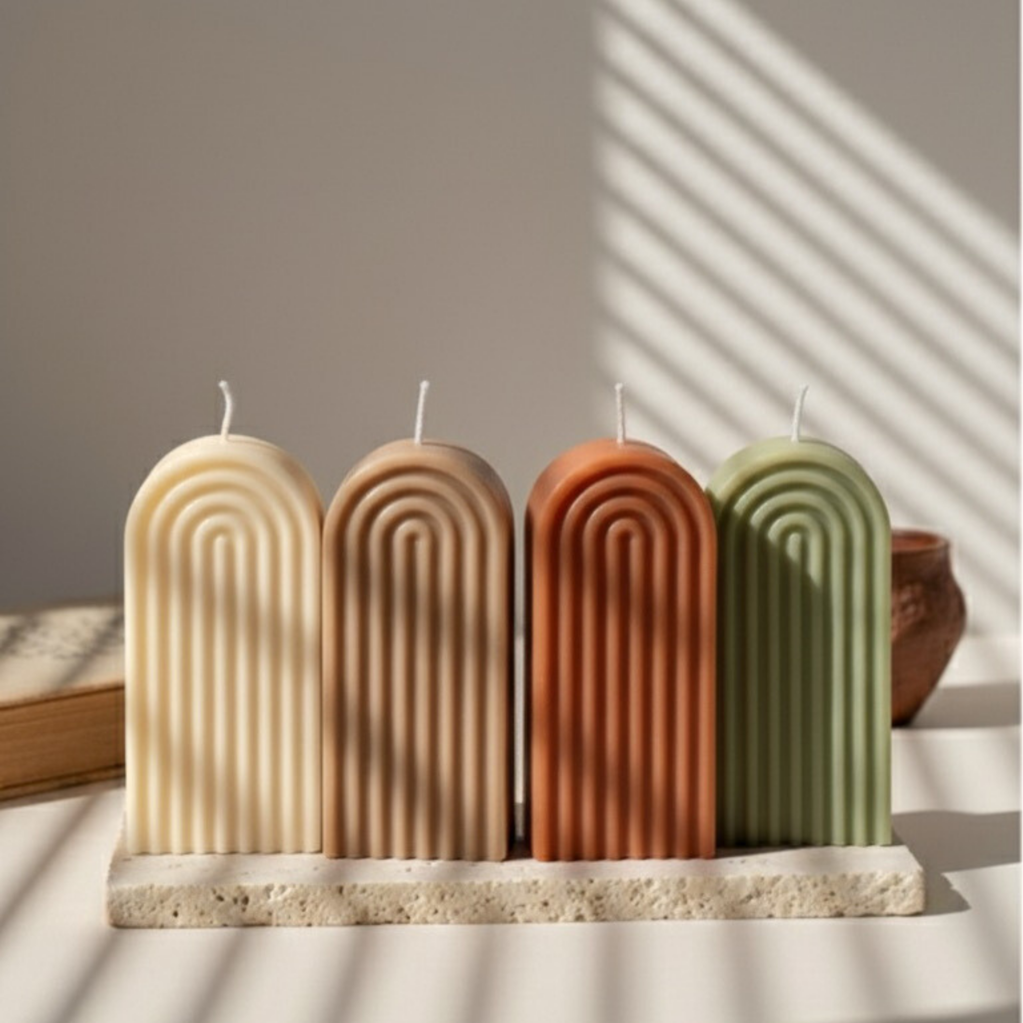 Disponible en quatre teintes chaleureuses : terracotta, pistache, blanche ivoire et marron, cette bougie décorative est conçue en cire de soja 100% végétale avec une mèche en coton.