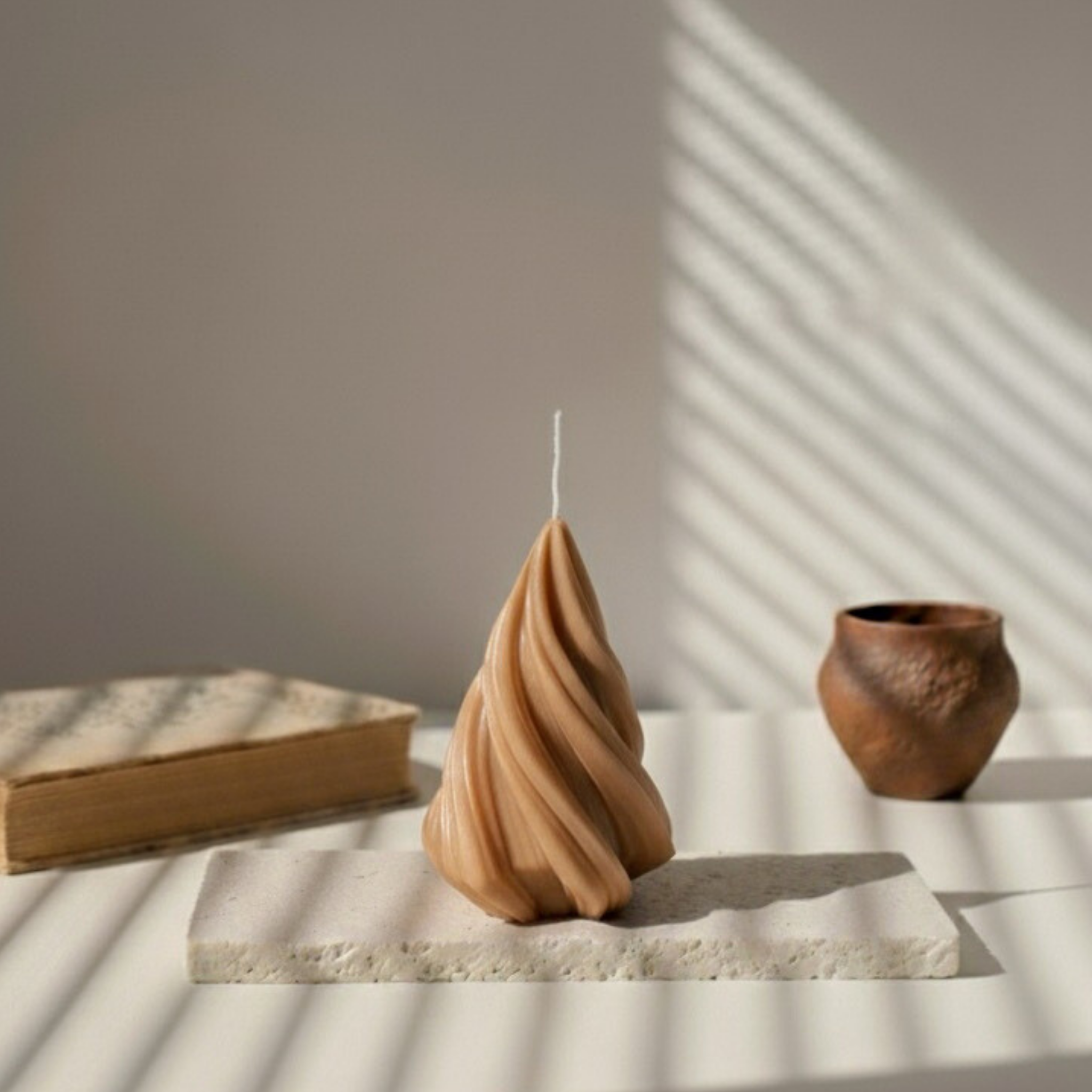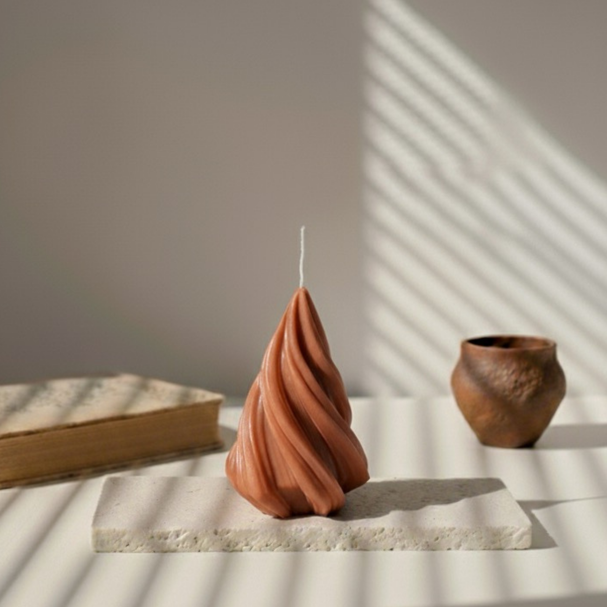 Disponible en quatre teintes chaleureuses : terracotta, pistache, blanche ivoire et marron, cette bougie décorative est conçue en cire de soja 100% naturelle avec une mèche en coton.