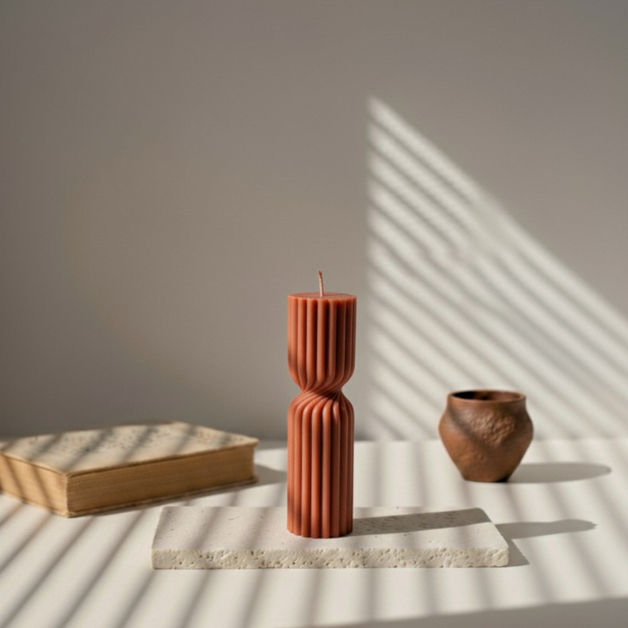 Disponible en quatre teintes chaleureuses : terracotta, pistache, blanche ivoire et marron, cette bougie décorative est conçue en cire de soja 100% naturelle avec une mèche en coton.